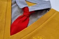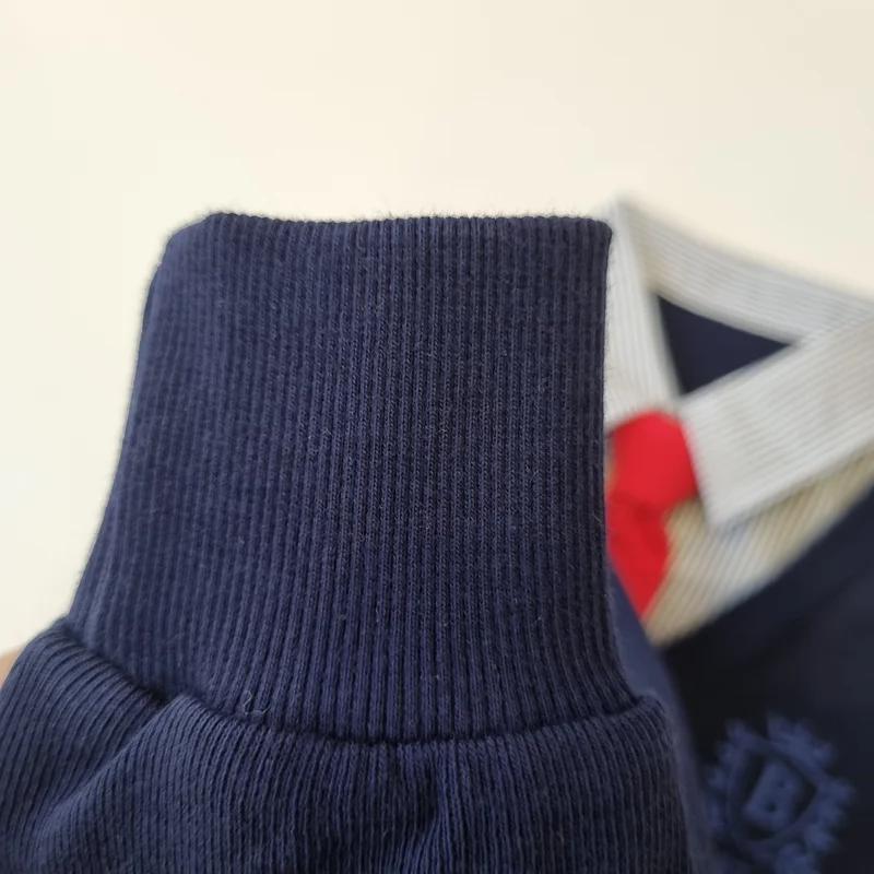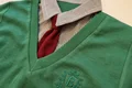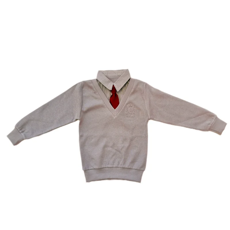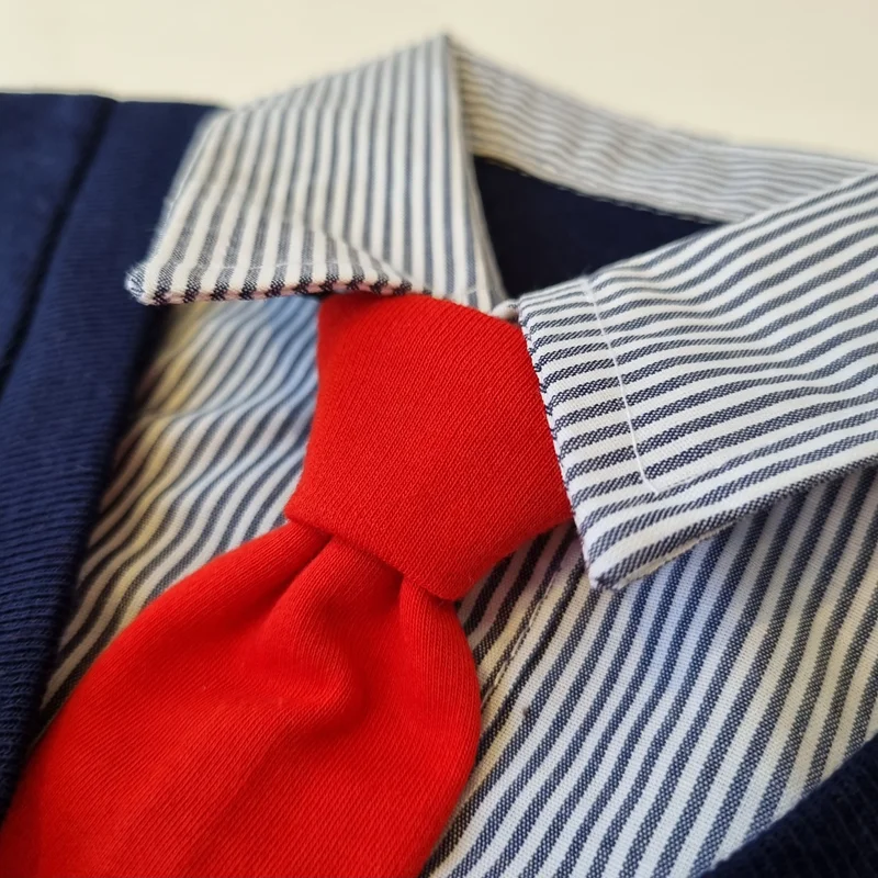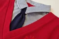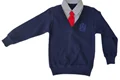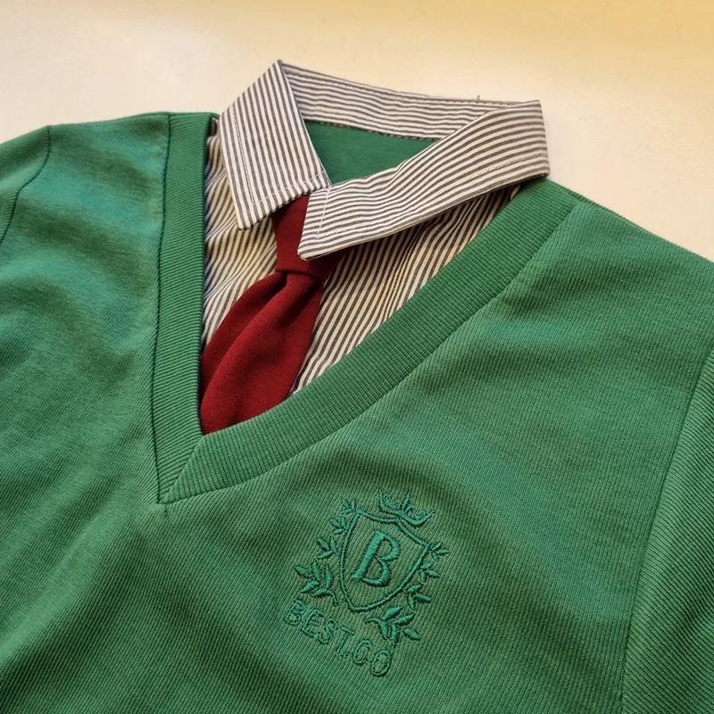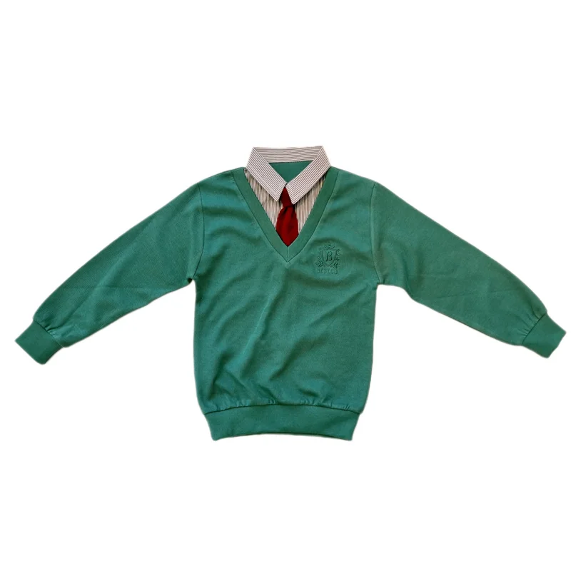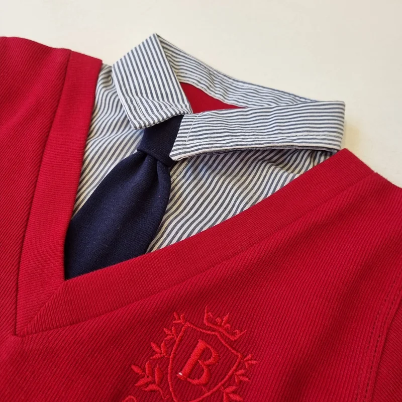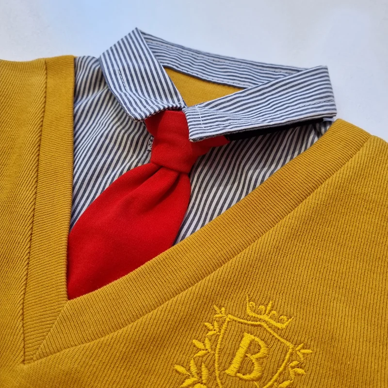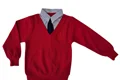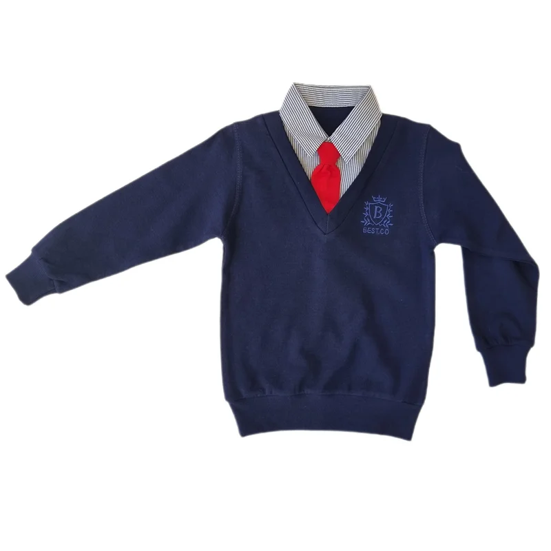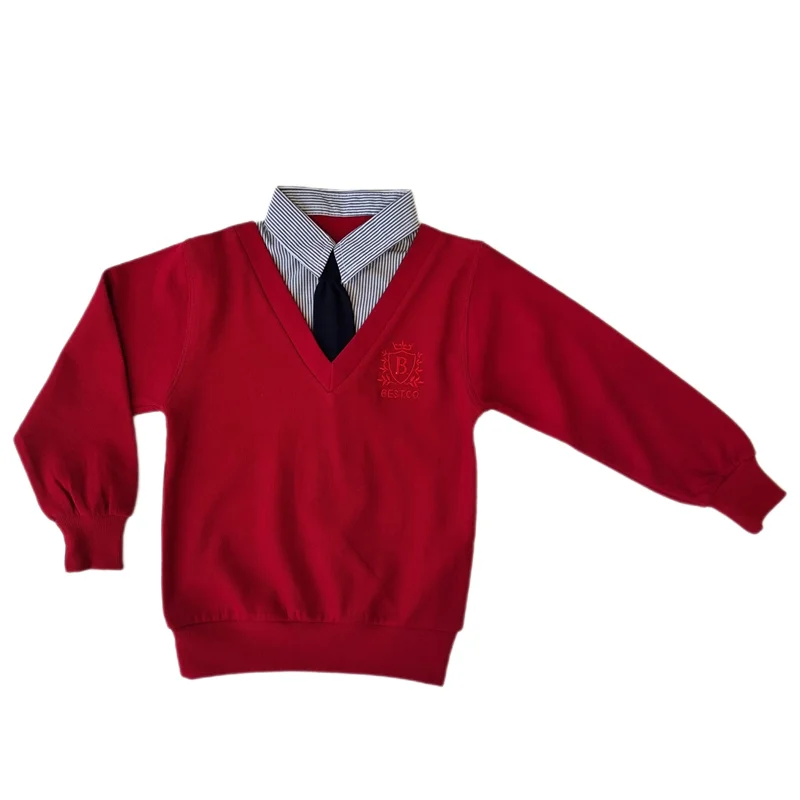 بلوز دو یقه پسرانه با کراوات کش دار و قابل جدا شدن می باشد. قسمت یقه چسبیده به پلیور بوده و جدا نمی شود. رنگ پیراهن سفید با راه های سرمه ای و رنگ پلیور ها زرشکی تیره مایل به قرمز و سرمه ای و طوسی و سبز و خردلی (طبق عکس) می باشد.لازم به ذکر است کراوات بلوز خردلی، سرمه ای است/کراوات بلوز سرمه ای ، زرشکی است/کراوات بلوز زرشکی سرمه ای است/