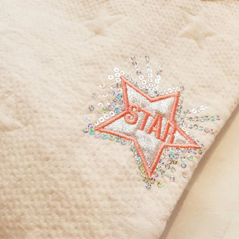 بلوز نخ پنبه ای با طرح برجسته ی ستاره طرح ستاره گلدوزی و پولک دوزی شده ضخامت و کیفیت کار در عکس ها مشخص شده است.