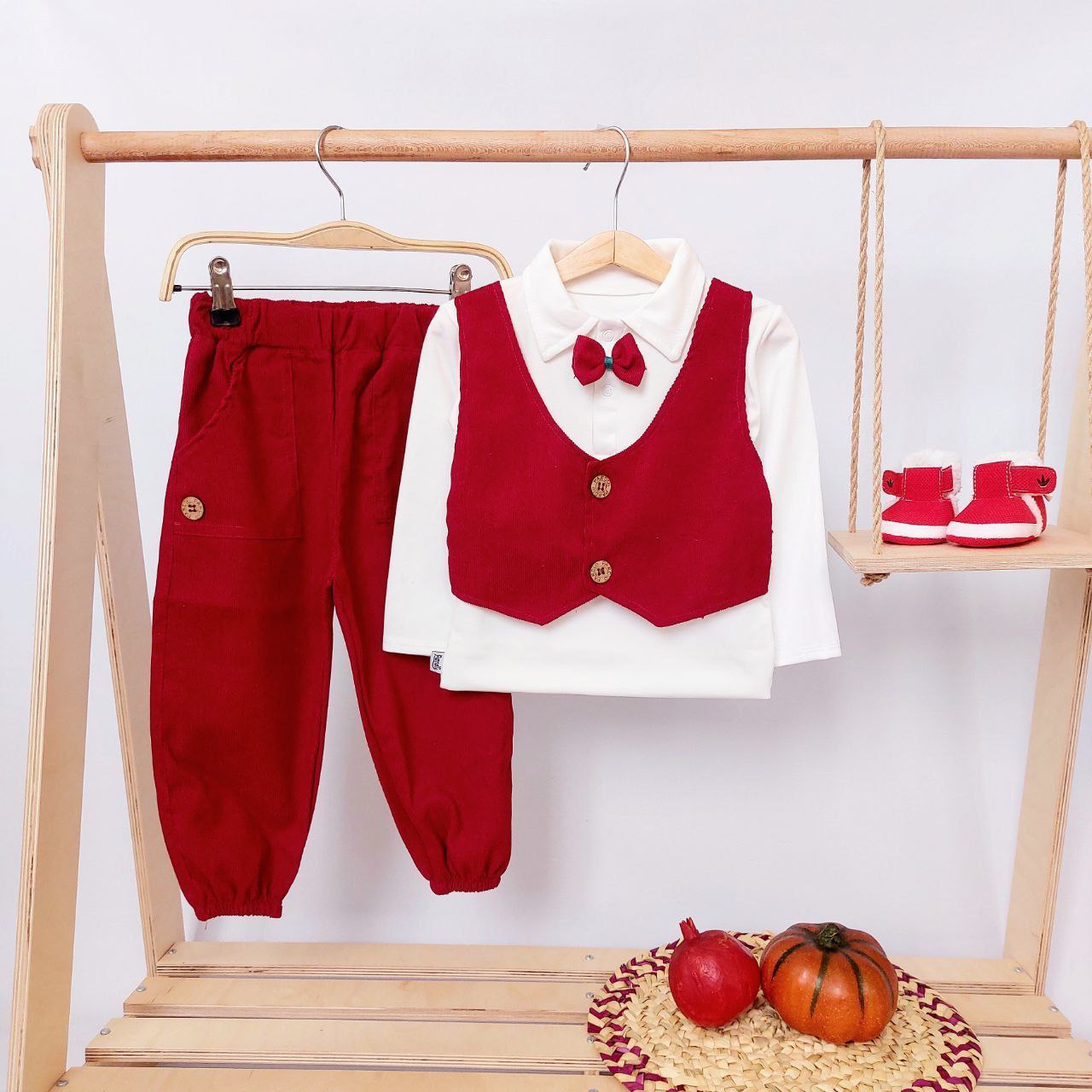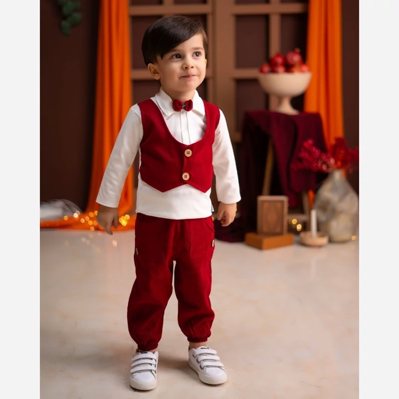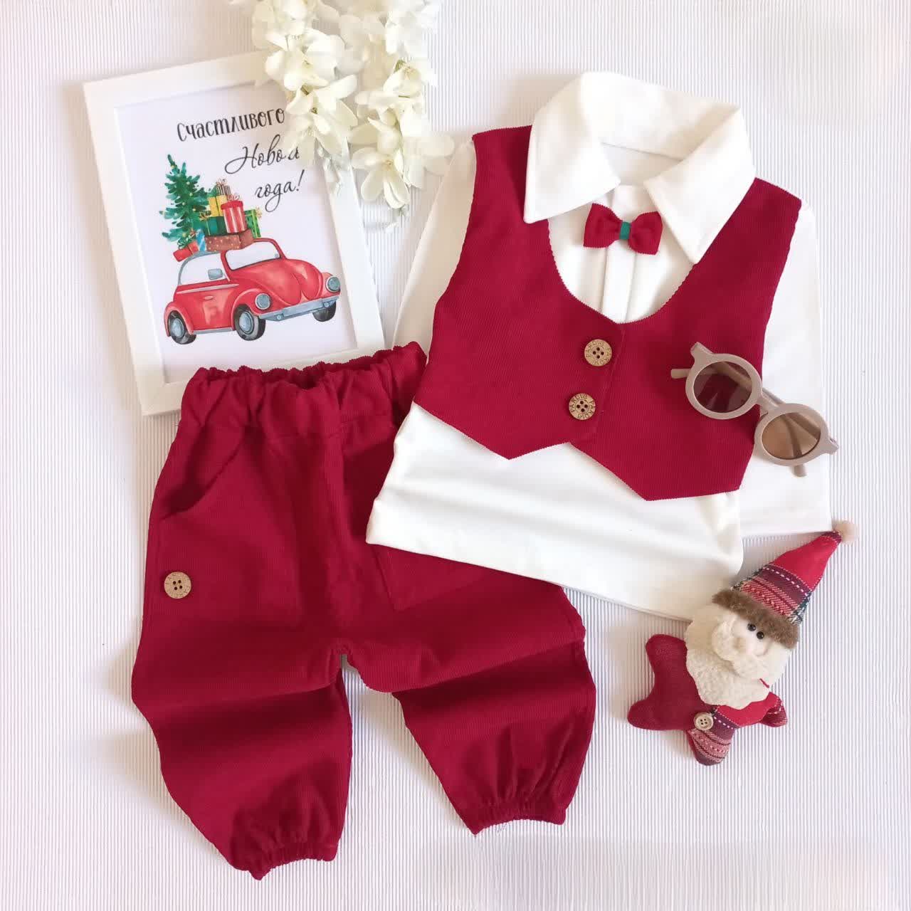 جنس بلوز نخ پنبه و شلوار مخمل کبریتی مناسب برای یک سال تا سه سال آمادهاید شب یلدایی فراموشنشدنی برای کوچولوی خود بسازید؟ ست بلوز شلوار یلدایی پسرانه مدل ماکان با طراحی شیک و پاپیون جذاب، انتخابی بینظیر برای جشنهای خاص! راحتی و زیبایی در کنار هم؛ با این ست خاص، لحظات شیرین یلدایی را ماندگار کنید. هماکنون خرید کنید و لبخند به ارمغان بیاورید!
