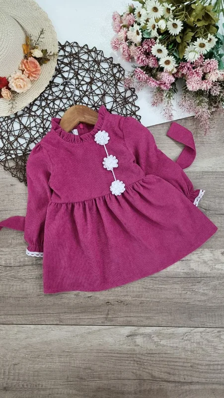 پیراهن دخترانه از جنس مخمل کبریتی رنگ کالباسی با تنخوری عالی و قواره ی استاندارد می باشد. پشت کار زیپ دارد و سرشانه چین ریز دارد و آستین چین دار عروسکی با نوار گیپور می باشد. لطفا برای انتخاب سایز مناسب حتما سانت بندی را چک بفرمایید.